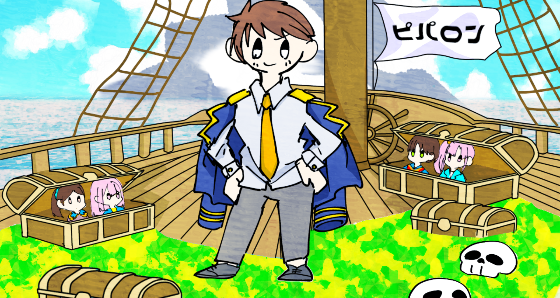 次のニュースです。ピパロン諸島の小島で伝説の大海賊フリントの大秘宝ツーピースが発見されました。発見したのは我がピパロン王国が誇る王宮軍のドクラ隊長です。